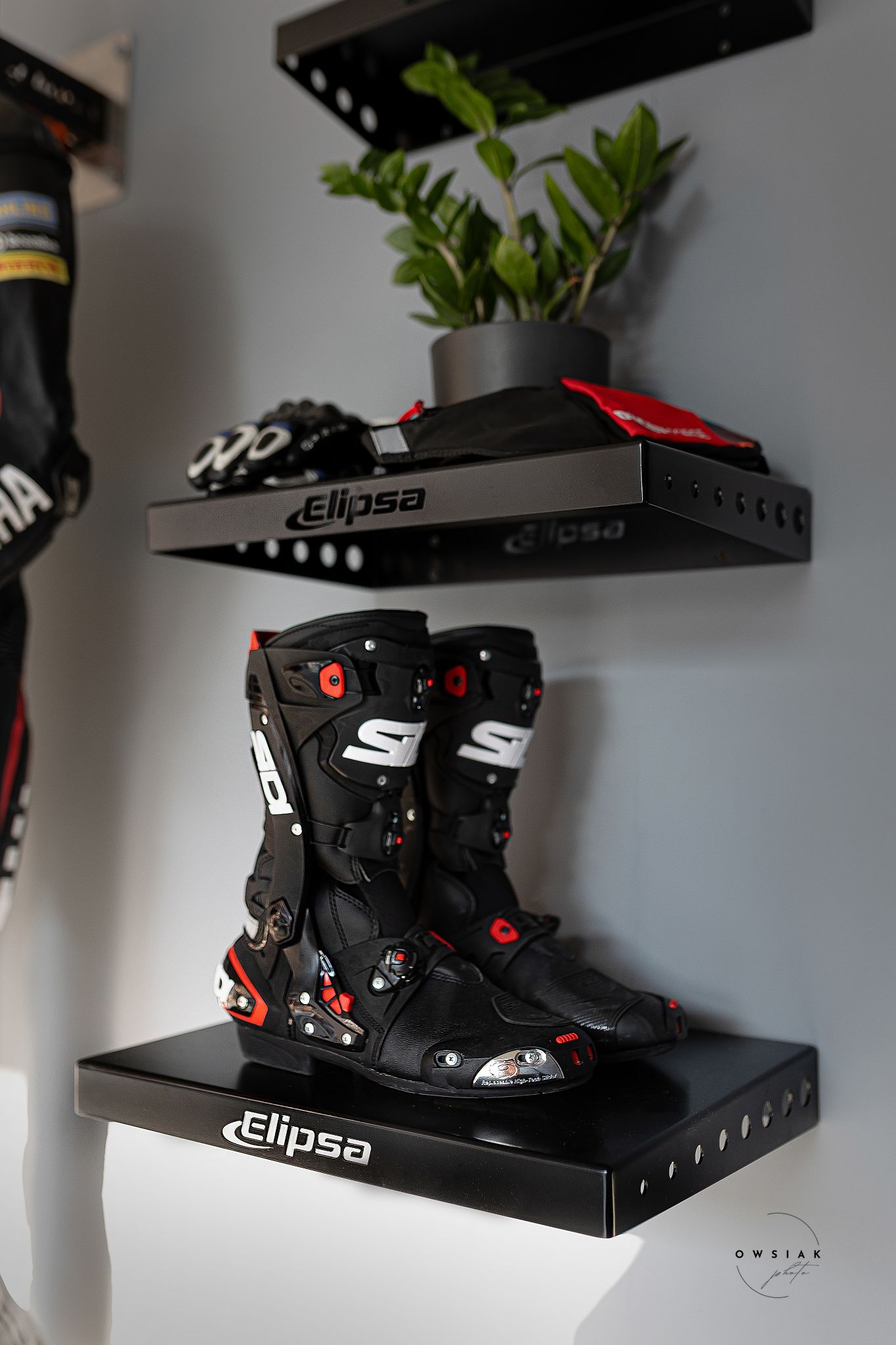 Półka ELIPSA to doskonałe rozwiązanie dla miłośników motocykli, którzy pragną w stylowy sposób przechowywać swoje akcesoria. To także świetny sposób na wyeksponowanie swojego kasku, który stanie się ozdobą każdego wnętrza.